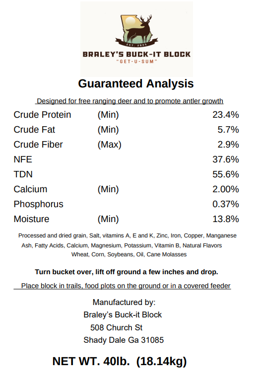 At Braley's Buck-It Block, we specialize in providing -23%-high protein feed blocks for deer in a convenient 40lb bucket. Our products are pressed into a block and placed in a reusable 5gal bucket for easy carrying. The Feed block is rock hard and will last out in the weather for weeks. When placed in a covered feeder it will last much longer.